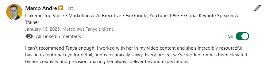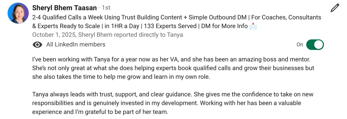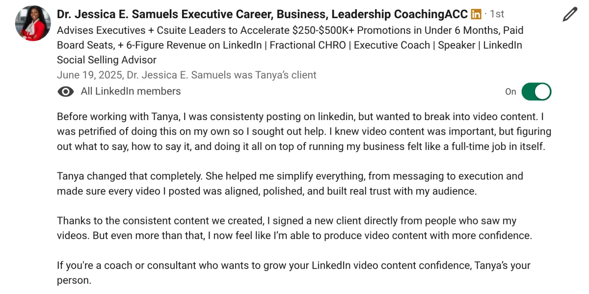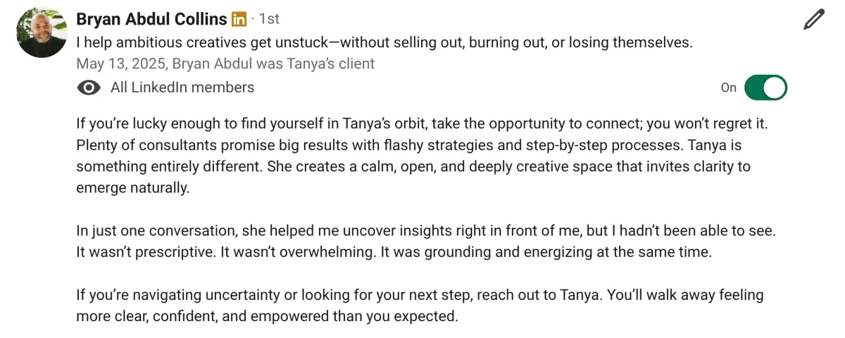 "Tanya goes above and beyond expectations. She helped me more than any business coach."